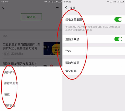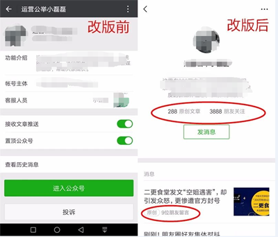 这种改版,实际上是根本性的改变了微信状态栏。把先前的“变色龙式状态栏”改成了“沉浸式状态栏”,另外还有更加细分的“黏性沉浸模式”,这些都是主流的状态栏类型。 “沉浸式状态栏”的界面会占据整个屏幕,系统自动隐藏系统状态栏和导航栏,让应用程序里内容可以在最大显示范围呈现,增加大屏体验。当需要查看通知的时候,只需要从顶部向下滑动就能呼出通知栏,这种模式比较适用于阅读、 杂志类应用。 从这点上看,微信这次改版,大大增强了用户的视觉及阅读体验。用户阅读时是不能被打扰的,如果需要深度阅读,那么使用沉浸式状态栏无疑是最好的选择。 这对微信生态里的内容创作者们、公众号运营者们绝对是一个利好兆头! 3、公众号资料界面 改版前:进入公众号会话界面,点击右上角的“人像”图标后,主要有功能介绍、帐号主体、查看历史消息、置顶功能和接收文章功能。 改版后:新增了公众号的原创文章数、朋友关注数、近期好友留言数最多的文章。而置顶功能、接收文章功能、添加到桌面等功能被折叠到更深的入口中。
