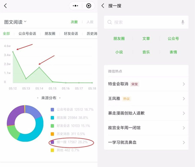 搜一搜功能同样如此,前几天我们发布了一篇关于《二更》的文章,由于该热度很高,使用搜一搜功能的人特别多。 所以在发布后的第三天,又有一波小高潮,有26.2%的阅读数来源于搜一搜。从这点可以看出,微信的搜一搜已经取得了很大的成功,对于我们公众号从业者是一个利好消息。