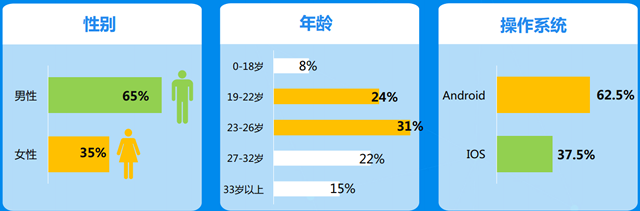 陌陌作为早期的一款基于LBS的社交移动软件,有着不可替代的人流量优势。如今,陌陌用户已经超3亿,基于社交、移动、兴趣、位置四个维度分析,陌陌现已拥有各种身份标签的用户。现在陌陌的月度活跃用户有8110万,人均使用40分钟/天。我们在做推广的时候要想将广告精准推送给这些人群,势必要做好用户画像的分析。 一、 陌陌用户集中在32岁以下,以男性用户居多 据统计,陌陌的男性用户占比65%,占主要用户。同时年龄主要集中在32岁以下,安卓用户较多。