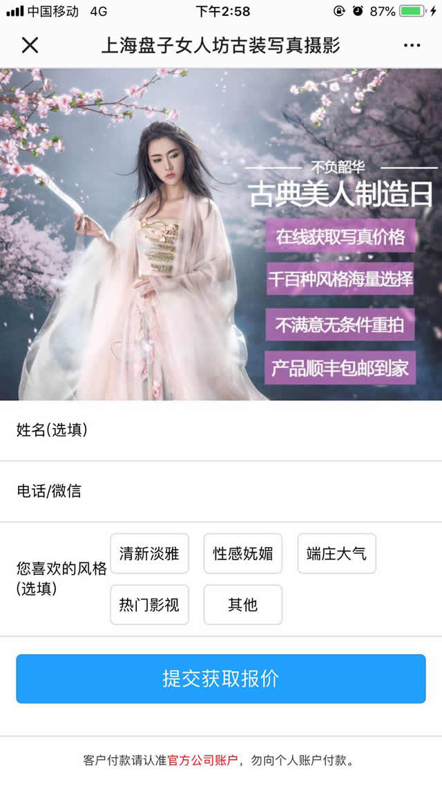 另外,落地页可放上实景拍摄图,拍摄成品,这是吸引用户拍摄的重要因素,广告主不可忽略。 三、精准的人群定向 现下依然是很多女性群体对摄影产品比较感兴趣,无论是婚纱摄影的选择还是单纯的个性写真,以及儿童摄影都是由女性选择,因此,摄影产品的定位人群可以选择18岁以上的年轻女性。 摄影行业在腾讯视频投放的优势很多,但是广告完善也是不可或缺的方面,如果您想要在腾讯视频上投放广告可以联系我们,我们有专业的广点通营销团队为您优化广告投放,赢得高效的网络推广!