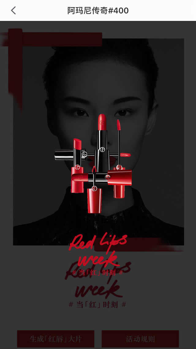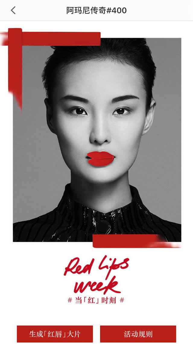 三、创意互动促进有效转化 图片快闪最后我们可以看见生成【红唇】大片的选项,我们可以选择自己照片作为素材验证产品使用效果。这也是阿玛尼广告的创意之处,在实现和消费者有效互动的同时让产品深入人心。