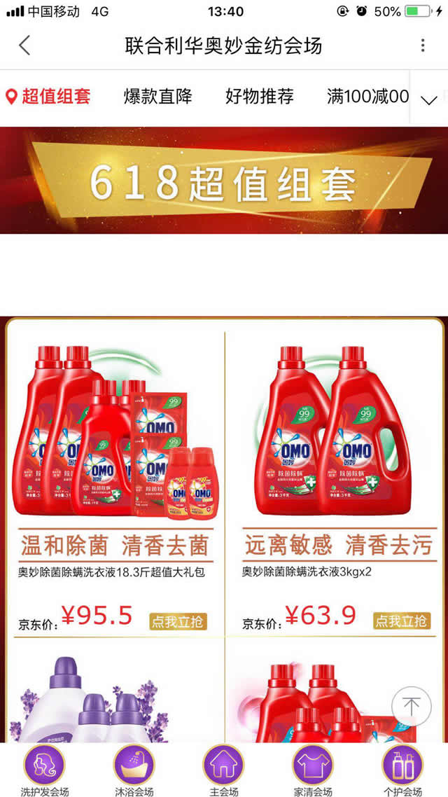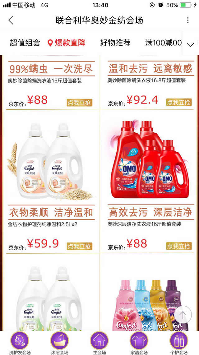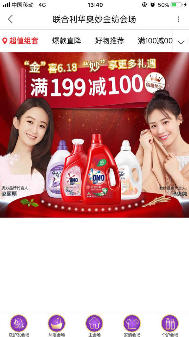 落地页设计方面,奥妙不仅突出代言人的优势,同时直接将产品的活动突显出来,推出超值组套、爆款直降等,为用户制定了多种选择方式。