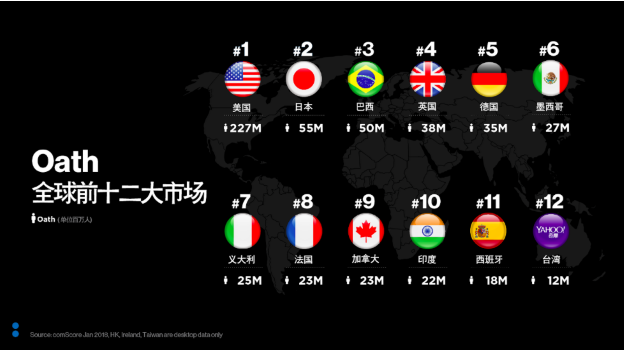 众所周知,随着移动消费市场慢慢进入饱和期,销售和增长逐渐缓慢。全球各大电信巨头和互联网接入服务提供商都在尝试开拓新业务。在这样的浪潮下,美国电信巨头Verizon作为全球品牌价值排名前十的公司选择了收购Yahoo和AOL(美国在线),并将这两家公司合并为成立一家名为Oath的新公司,Oath将目标放在新兴的网络市场,计划在全球通过网络服务获利。 Oath全球共有10多亿用户数量,50多个知名品牌,在全球前12个市场拥有超过千万用户数量,以及全球認證最大的用户数据量。在如此庞大的用户基础和海量数据下,Oath提出自己的核心理念:通过移动营销拓展全球。