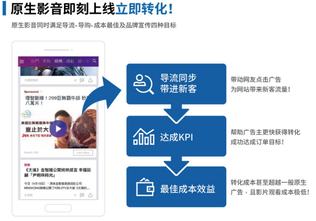 对于Yahoo来说是将广告植入在新闻页面中,类似于新闻的形式,将这些类似于新闻的原生广告用户分类推送到感兴趣的受众面前,看到这些广告并产生兴趣的受众才会点击,帮助广告中减少无效点击和误点,节省广告费用。例如财经类广告推送在对区块链、比特币、股票比较感兴趣的用户面前。 Yahoo的原生广告视频投放是以CPC计费,只有客户点击才会付费,这是Yahoo区别于其他视频广告平台的一大优势。