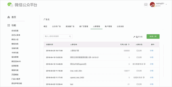 互选广告支持公众号推广广告示意 3、人群管理系统支持智能拓展 为进一步提升投放端数据应用能力,投放端在已有的人群管理功能上增加高级功能。通过高级功能入口,可以跳转到腾讯社交广告数据管理平台(DMP),实现人群智能拓展(lookailke)和人群洞察分析等能力。
