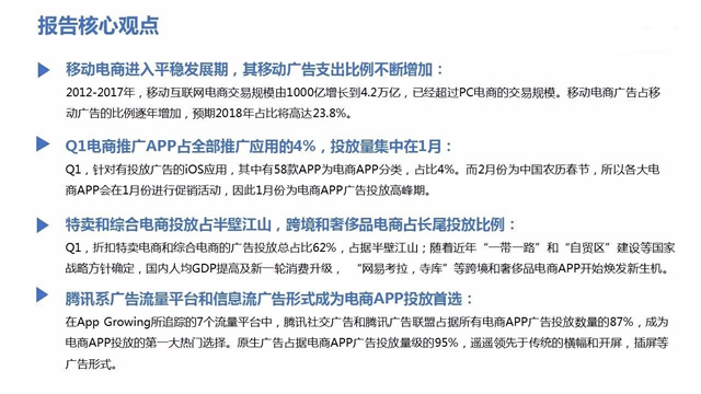 以第一季度追踪到电商APP广告投放数据为依据,发布《2018年Q1中国电商APP广告投放分析报告》,核心包括以下内容: