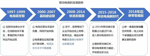 1月1日-3月31日所追踪的IOS应用的移动广告投放数据及App Store商店数据。所涉及的渠道为腾讯社交广告(广点通)/ 腾讯联盟广告/ 今日头条/ 阿里汇川(UC) /网易易效 /百度信息流 / 爱奇艺。 一、移动电商进入平稳发展期,其移动广告支出比例不断增加 1)移动电商步入新时代,线上线下融合成为新零售发展重要趋势 经过20多年的发展,移动互联网电商(以下简称移动电商)历经了5个时期,同时随着国内智能手机的普及和移动支付环境的日渐成熟,移动电商的交易规模已经超过PC,迈入新的时代。而未来,线上和线下的融合也将是新零售发展的重要趋势。
