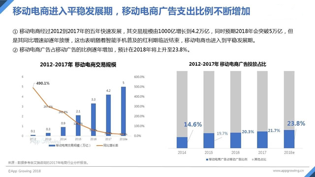 2) 移动电商进入平稳发展期,移动电商广告支出比例不断增加 2012-2017年,移动电商交易规模由1000亿增长到4.2万亿,预期将于2018年突破5万亿,但是其环比增速却逐年放缓,这也表明随着智能手机普及的红利期临近结束,移动电商也进入到平稳发展期。同时,移动电商广告占移动广告的比例逐年增加,预计2018年将上升至23.8%。