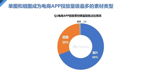5)单图和组图成为电商APP投放量级最多的素材类型 与游戏等行业相反,单图和组图成为电商APP投放选择最多的素材类型,两者Q1投放量级合计占比99%,而最近比较受其他行业广告主欢迎的视频广告形式仅占1%。 据对部分资深电商优化师的调研,优化师们反馈单图和组图更容易表现商品的属性和卖点,同时降低用户接触广告信息的成本(视频需要占据用户观看时间),能够提高用户的点击和下载转化率。同时他们也表示促销类和模特场景类的素材表达方式更能抓住用户眼球。