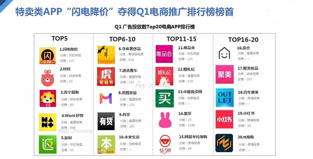 三、Q1 电商APP广告投放排行风云榜概览 1)特卖类APP“闪电降价”夺得Q1电商推广APP排行榜榜首 在Q1电商推广APP广告投放数排行榜中,排名第一的是“闪电降价”,58同城旗下的二手交易电商“转转”排名第二,“苏宁易购”排名第三。同时Top20的APP,75%有进入 App Store总榜(免费)前1500名。