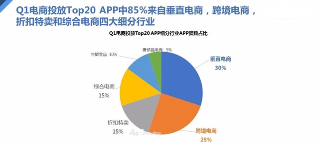 2)Q1广告投放数电商APP Top20 85%来自垂直电商,跨境电商,折扣特卖和综合电商四大细分行业 在电商投放广告数Top20排行榜中,共有6个垂直电商APP,占比最多占比30%;占比第二大的跨境电商则有五款APP,折扣特卖电商和综合电商分别有3款APP,各占比15%;生鲜电商和奢侈品电商分布为2个,1个。