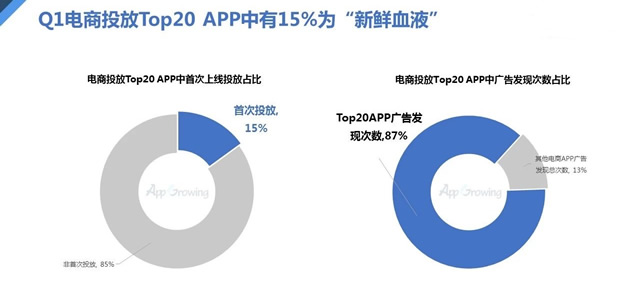 3) Q1电商投放Top20 APP中有15%为“新鲜血液”, 其余85%持续稳定投放 根据广告追踪数据,在电商投放Top20 APP中,有3个APP是Q1首次上线投放的,分别是“美图美妆”,“本来生活”,“良仓”,占比15%,而其余85%的APP从去年一直持续投放到今年Q1。另外Top20电商APP的广告发现次数占全部电商推广APP的发现次数的87%。