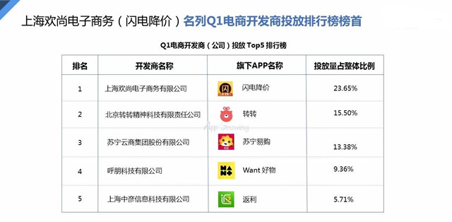 4)广告投放数Top20 APP中,闪电降价1,2月份连续两个月霸榜,转转及苏宁易购连续3个月均在榜单前10 在电商APP广告投放数Top20 中,闪电降价在1,2月份连续两个月蝉联榜首位置,但是3月份其投放量级有下跌,而从后面的综合排名第2的转转到第12名的婚礼纪,1-3月份均在各个月份投放榜单Top20,投放比较稳定。 四、Q1 电商APP开发商广告投放排行风云榜概览 1)上海欢尚电子商务(闪电降价)名列Q1电商开发商投放排行榜榜首 闪电降价由于在电商APP广告投放排行榜中排名第一,因此其开发公司也毫无疑问的在电商开发商广告投放数排行榜中占据榜首。同时我们再看排名第二到第五的公司,旗下投放的APP也跟电商APP投放排行榜的排名保持一致。