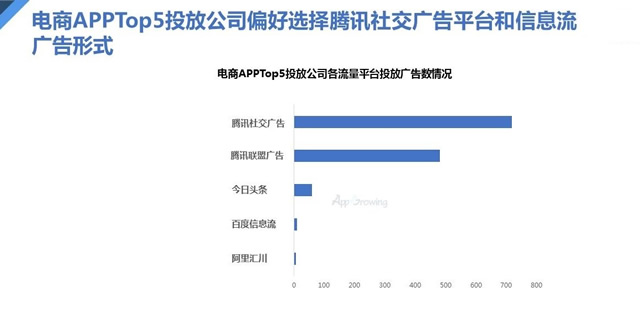 3)流量平台和广告形式投放倾向分析:电商Top5投放公司偏好选择腾讯社交广告平台和信息流广告 在流量平台的投放选择方面,腾讯系的广告流量平台除了受到整体电商投放公司的喜爱,还受到其中Top5公司的垂青,腾讯旗下的社交广告和联盟广告分别在流量平台投放排行第一和第二名。在广告形式的选择上,Top5投放公司同样是主投原生广告。