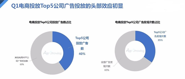 2)Q1电商投放Top5公司广告投放的头部效应初显 Q1电商投放Top5公司的投放广告数占整体电商投放公司的40%,同时Top5公司的广告发现次数占整体的35%。广告发现次数表示广告被追踪监测到的数量,该数据越大,则表明公司在广告投放的力度越高。因此从广告投放数和发现次数这两项数据看出,Top5公司在投放端占整体的比重颇高,头部效应初显。