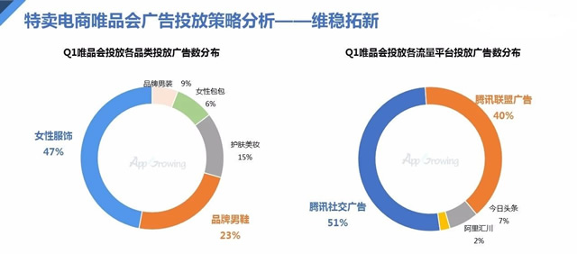 2)特卖电商唯品会广告投放策略分析——维稳拓新 根据所追踪的数据可以推测,2018年Q1,维稳拓新是目前唯品会广告投放的主要策略。 ① 集中维稳 主投信息流广告,集中投放在腾讯系相关渠道,腾讯社交广告及腾讯联盟广告渠道投放广告数占比高达91%; 整体广告投放创意主打“女性”“特卖”,而投放产品也集中在女性服饰鞋包核心品类(投放广告数占比68%)