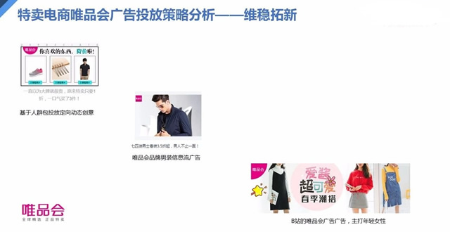 ② 拓新 唯品会投放新趋势体现在以下几点: 新技术的运用:更多采用deeplink技术,DMP人群包定向投放给老用户,结合动态创意,广告会自动抓取该用户产生过行为(浏览、收藏、收进购物车等)的产品来展示,有效二次唤醒用户促进购买。 拓展新目标用户人群:在维持女性用户的常规投放基础上,拓宽流量池,通过品牌男装男鞋定投男性用户来导流。 拓展低龄女性人群:拓展低龄女性人群,同时限制定投付费能力较高的渠道,诸如抖音,美拍,b站等平台