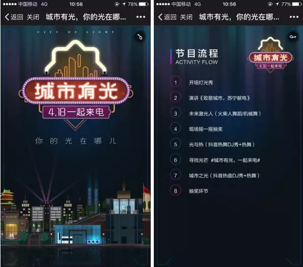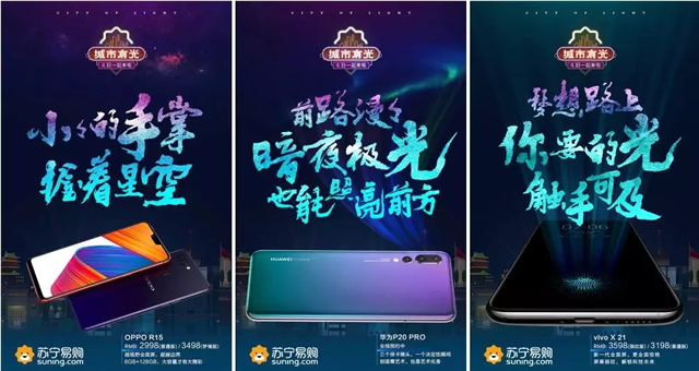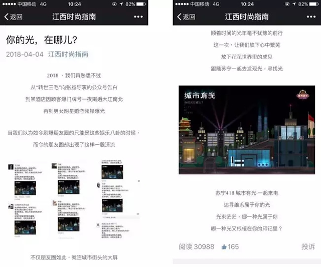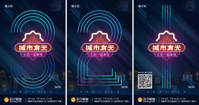 我们都知道,如今的快速节奏生活,使得各大群体对任何事件的注意力越来越短,但是,他们也有快速关注的特性。一个事件抛出时间超过1天基本上热度已过,如果持续不间断递进发酵,才会有可能达到预期的效果。而苏宁易购的这次营销,恰好完美地把握住了这些关键点。 与此同时,线上传播固然重要,但对于目前唯一拥有双线资源的苏宁易购而言,线下的活动则更加不可或缺。418当晚,苏宁易购在人流量密集区开展了线下寻光活动。 线下活动 #城市有光,一起来电#