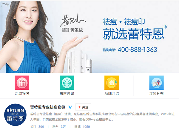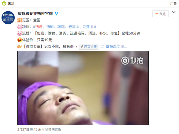 答案当然是可以的。值得注意的是,在微博粉丝通上进行祛痘类广告投放需要广告主提供相应的产品资质,资质通过审核后方可进行广告投放。那么祛痘行业在微博粉丝通上进行广告投放需要注意什么呢? 1、慎用对比图 很多广告主为了突出自己产品的有点,在微博上发一些祛痘前和祛痘后的对比图,我们且不说这些图片的真实性,但是这样的图片是在是令人倒胃口,会引起强烈的不适感。这样的广告图片千万不要再用了,否则,你只会吓走你的客户。 2、突出专业性 祛痘这件事情可大可小,并不是随随便便哪个小门店就可以做的。如果不突出自己的专业性,是无法让用户产生信任感的。那么我们在制作广告宣传片时,创意可以从这一点入手。 3、文案突出主题 如果广告宣传主要突出服务的专业性,那么我们广告推广的文案里面就要体现这次推广的主题。例如下列这则广告: