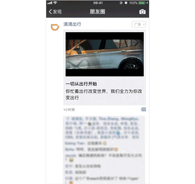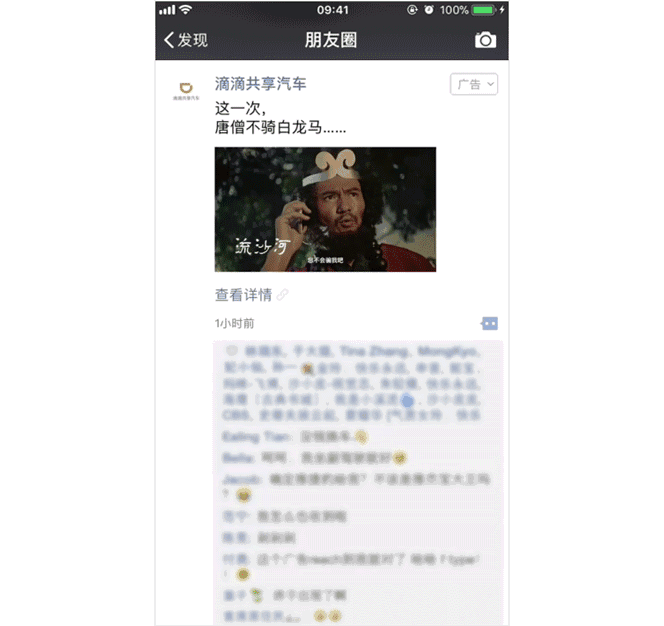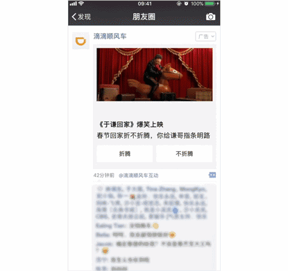 ofo小黄车公众号互选广告示意 产品推广:新功能上线,提升使用率 产品新功能上线,是共享出行品牌进行用户沟通、唤醒使用需求的良好契机。借助微信广告发布新功能,可以有效吸引用户互动参与,结合卡券发放功能,还能快速实现转化闭环。 滴滴快车(现已更名为“滴滴共享汽车”)在站点拼车功能上线之际,以唐僧师徒四人拼车出行的创意投放朋友圈广告,借话题吸引社交互动,配合优惠活动提升投放效果,最终广告整体表现远超行业均值。