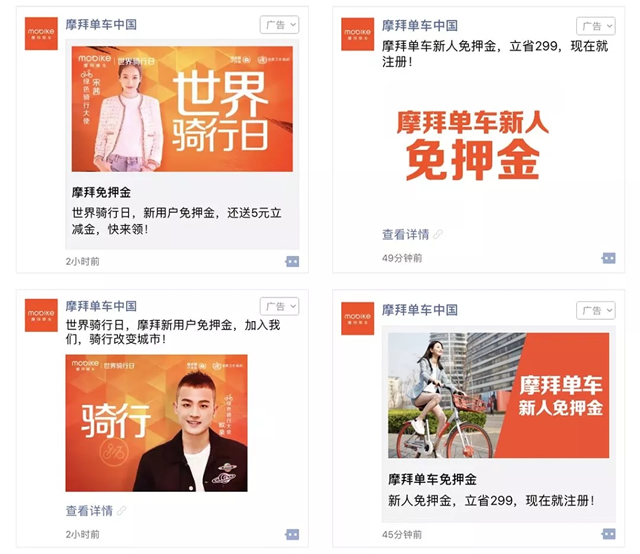 滴滴顺风车朋友圈广告示意 拉新促活:提高转化率,优化曝光价值 拉取新用户的同时提升老用户活跃度,这是共享出行品牌始终存在的需求痛点。oCPM智能投放帮助广告主在控制成本的前提下提升转化效果,竞价+合约配合投放,可以通过反复测试优化,最终实现更佳效果。 “世界骑行日”之际,摩拜单车中国以推广小程序为基础,配合免押金活动,进行用户拉新活动。广告采用竞价+合约的投放策略,从投放初期到常规投放,转化成本下降70%,累计触达超过9000万用户。