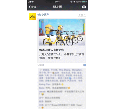 ofo小黄车朋友圈广告示意 最终广告效果出众,朋友圈广告总互动点击率超过行业均值41%,公众号互选广告点击率最高达21%。