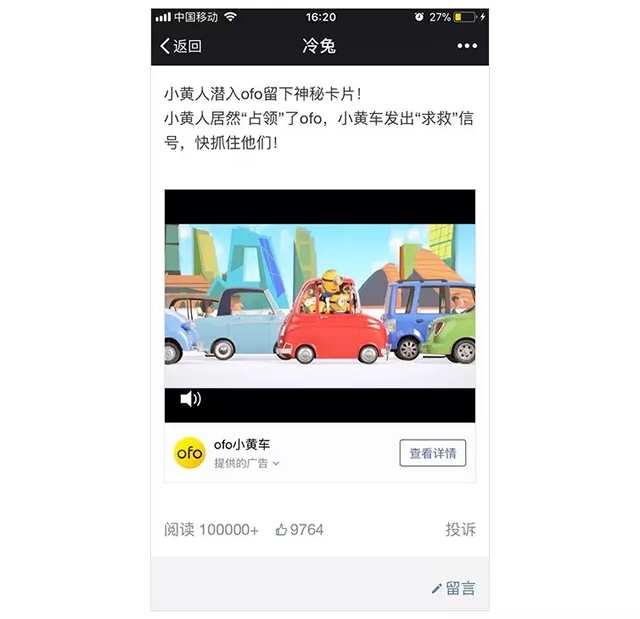 滴滴出行朋友圈广告示意 ofo小黄车借势小黄人进行IP营销,朋友圈广告+公众号互选广告组合投放,创意素材+KOL发声引起广泛关注。