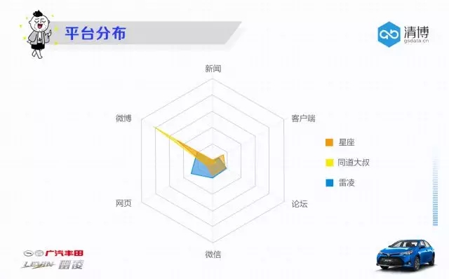 “知名星座命理博主”@同道大叔 在微博拥有1414万粉丝,是星座领域具有广泛影响力的KOL。其微博主要受众群体与主流汽车品牌消费人群,在年龄结构上有较高的契合度。对于“雷凌”而言,借助同道大叔(星座)在19-24岁女性群体中的广泛影响力,能够有效突破汽车品牌,在人群结构上固有的传播壁垒,打入新兴的汽车消费市场。 二、选好传播平台有效影响消费者的品牌认知