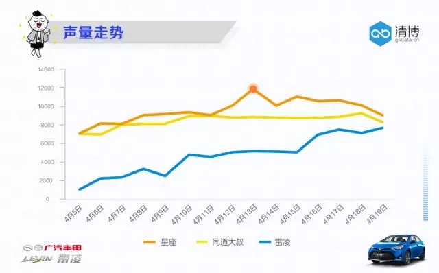 4月10日,@广汽丰田 雷凌185T,借助消费者对“星座”的关注,定制话题#杠精回击指南#,引导大家对生活中十二星座性格特点的讨论,通过标签化的印象,将十二星座的买车需求清晰勾勒出来。 16日,联合@同道大叔 跨界产出雷凌定制视频《如何应对“超严格”12星座》,雷凌“颜值高、动力足、性价比高”的形象呼之而出。 18日,@开车编辑部 定制星座文章《星座购车笔记》,针对每个星座在选车问题上的关注点与决策因素,带动话题深入发展。“星座”“同道大叔”巧妙引导话题,“雷凌”大众声量随节点稳步增长。 通过以上三步策略,雷凌185T和同道大叔的合作产生明显效果: 效果一:雷凌185T和同道大叔、星座实现完美融合