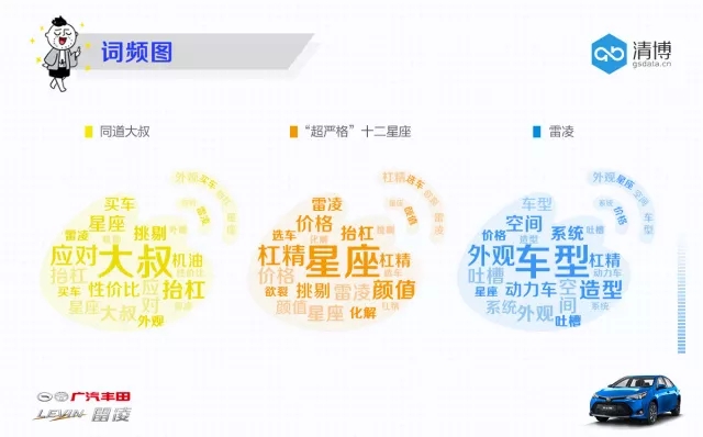 “同道大叔”“雷凌”,以及话题#杠精回击指南#关于“‘超严格’十二星座”的讨论中,“雷凌”“车型”“颜值”“外观”“动力”“性价比”成为共同出现的高频词,“雷凌”成功植入话题之中,成为用户关注的焦点。“扛精”“吐槽”“挑剔”等挑战,被“雷凌”逐一征服,雷凌汽车获得“超严格”12星座的认可。 效果二:活动前后雷凌汽车的网络好感度提升46%
