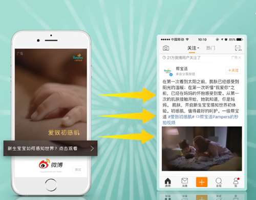随后,帮宝适继续借用广告发力,投放微博开屏广告,以动态视频样式呈现,病毒式营销,紧抓用户消费,提升销售额。