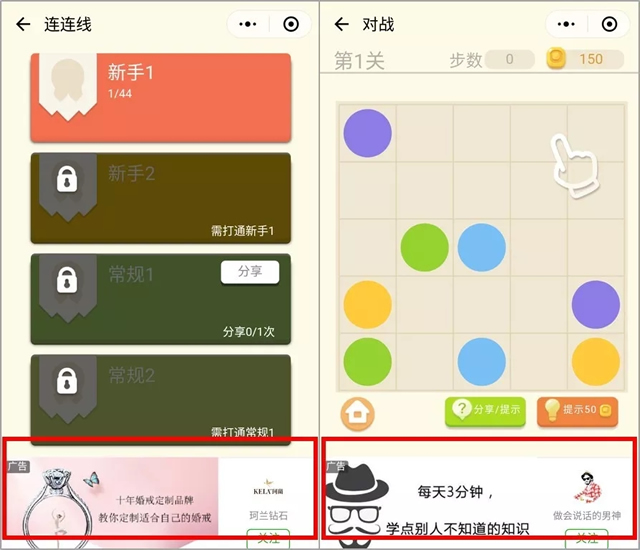 底部banner广告强曝光 每日庞大的活跃用户基数下,借助强曝光的广告内容,可帮助广告主实现不错的引流增长。 公众号引流、app下载引导、电商小程序引流等对用户量较为敏感的投放需求,与小游戏用户的特点具有较高的匹配度。在小游戏较为火热的今天,小游戏内的广告位,在短期内可谓不容错过! 目前,小游戏、小程序内的广告投放尚处红利期,近期内具有较高的投放性价比,并且亦可带来不俗的投放效果。 微信这片营销人眼中的广袤的田地,虽耕耘多年,但伴随平台的不断迭代,总能为营销圈带来新的惊喜。小程序生态的建设与发展也为我们展现了更多的机会与可能性...... 这次小程序上的风能吹多久呢?我们共同期待!