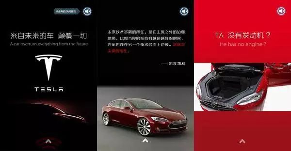 图文成为攻入用户朋友圈的唯一方式。但静态图片和文字在吸引用户目光上存在天然缺陷,大量同质的、毫无新意的图文内容也对用户造成严重打扰,被用户判定为“垃圾”直接过滤掉。图文之外,是否有其他适合朋友圈展示的方式?当时,微信4.0版本已经开放了第三方接口,外部APP的内容可以接入微信平台,富媒体展示成为一个全新的值得探索的方向。 但第三方接入步骤繁琐,且面临着适配问题。在解决这些问题的过程中,人们发现了一个完美契合手机端、轻量却能展示丰富效果的形式——H5。自此,开启了一个全新的微信营销时代。 2014萌芽,攻克“注意”和“社交”两个底层壁垒 2014年,萌芽期 面对微信用户被大量同质信息淹没、倍感疲乏、抵触营销信息的境遇,H5用了一年的时间破局。在这期间,H5攻克了“注意”和“社交”两个底层壁垒。上半年,让内容“动”起来,从“单页翻动”到“元素联动”到“与你互动”,用户的注意力在一次次地动态升级中被不断聚焦。下半年,H5小游戏不仅让互动升级,还有了反馈,游戏战绩成了平淡生活中的炫耀资本,“营销”悄然化身“社交”的一部分。 2014年上“能帮我做个会动的PPT吗?” 作为最早登录朋友圈的一批作品,特斯拉的这支H5保留了H5最初的模样:精美图片+简单的翻页动效,最终的呈现效果却超越了当时人们对微信营销的想象:原来还可以这样玩!