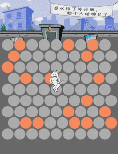 “摇一摇”,进入H5页面;“点一点”,探索油画般的伦敦清晨;“擦一擦”,使屏幕上的晨雾散去;点击“河面”,河水会随之泛起涟漪;最后点击屏幕上的白点,抵达终点上海。 H5的“交互”自此才有了和PPT不一样的含义,所有的动效都是基于用户操作,“为你而动”,撩动用户进行更深度的参与。 2014年下“给我做个神经猫那样的小游戏!” H5虽然以惊人的速度在进化,但2014年上半年始终没有达成“刷屏”成就。“社交”成为H5继续发展必须突破的一个壁垒。而这个壁垒,在2014年7月被七个字轻松击破——“简单好玩能攀比”。这七个字来自小游戏《围住神经猫》的制作团队,是团队为神经猫小游戏定下的基调。上线48小时,PV达1026万,即使放在今天也是不俗的成绩。