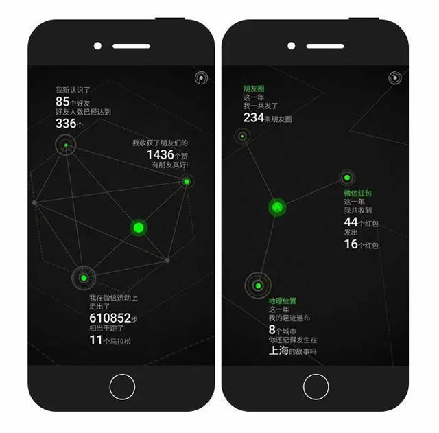 2016 & 2017繁荣,高端玩家入局,技术内容双升级 2016年 & 2017年,繁荣期 这两年可以说是H5到现在为止的发展历史中的高光时刻。腾讯、阿里、网易等高端玩家的入局,让H5实现了技术和内容的双升级。 2016年,H5背负的发展压力比以往都大。2015年的各种形式创新几乎将H5的呈现方式挖掘殆尽,H5即将衰落的论调甚嚣尘上。2016上半年几乎进入了H5空窗期,爆款寥寥。但下半年,腾讯、阿里、网易等高端玩家,带着雄厚的资本和技术实力,将H5推向了真正的繁荣期。《穿越故宫来看你》《里约大冒险》等的惊人视效+风格化内容、《天猫双11邀请函》的三维全景世界都令人惊叹。 2016年“我要一个酷炫的大制作!” 2016年腾讯值得一提的爆品共有4款:1月份的《我和微信的故事》、7月份的《穿越故宫来看你》、10月份的《韩寒说的比唱的好》,以及11月份的《薛之谦2个月没写微博段子,结果憋了个大招…》。《我和微信的故事》开启了年度总结H5中的“数据盘点型”流派。除去首页引导点击屏幕外,仅仅三页的H5,展示了用户与微信的点点滴滴:你是什么时候第几个注册微信的,第一条朋友圈是什么时候发的,第一个好友是谁,在2015年新加了多少好友,收获了多少个赞等等。 这些与“我”息息相关的信息,帮助用户找回了久违的回忆,引起了用户的疯狂刷屏。