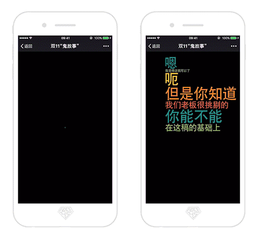 这种内容其实是我们日常生活中就会出现的小误会,熟悉而亲切,经过爆笑的“内心戏”演绎,乐趣瞬间满级,当然会想跟朋友分享。其后,网易考拉的两支“连续剧式”“戏精”H5——11月份的《入职第一天,网易爸爸教我做人》和12月份的《入职半个月,网易爸爸让我怀疑人生》,进一步巩固了网易在“戏精”H5届的地位。 不同于网易的“戏精”流派,阿里的“戏精”H5——《双11前,秋裤厂经理深夜给女设计师打电话》,则完全抛弃了内心戏。全篇仅以文字形式呈现“秋裤厂经理”提出需求和“设计师”满足需求的对话,这一对话过程本身已经足够好看,脑洞大开,还有“秋裤厂经理”极具港粤特色的口音加成,“五彩斑斓的黑”“闲庭信步,只穿秋裤”,稳赢!