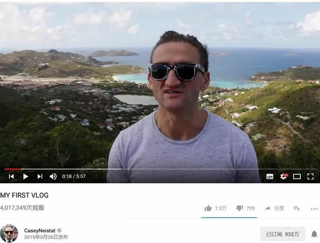 Casey Neistat的第一支vlog及标志性墨镜 直至2016年7月20日,Casey连续不间断地更新了490支vlog视频!vlog在全网的热度随着Casey一支支精心剪辑的视频投递而渐起,越来越多的人跟着他的vlog“玩遍纽约乃至世界,上天下海无所不至......” 通过vlog的持续更新,为Casey积攒了大批粉丝,时至今日Casey以成为拥有近千万粉丝的世界级网红,不少人因Casey的vlog挑战了解vlog甚至成为了一名vlogger。 虽然Casey一直强调坚持在youtube上投递视频你就能走红,但从他的经历来看,除了十年如一日的坚持外,同vlog制作的门槛要求一般,Casey的走红也绝对离不开他过硬的拍摄、剪辑和创意能力。其实,在Casey Neistat走红youtube前,就通过拍摄911袭击的实况记录,找到了自己的兴趣所在——视频拍摄。