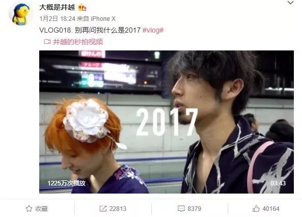 •大概是井越:最早走红于人人网,哲学系高材生。观点激进,带些高冷哲学思维,早期发表过一些颇具争议的言论,目前作为vlogger为大众所熟知,vlog内容主要为同女友游历世界分享生活的日常,vlog画面偏日式冷淡风,剪辑流畅,配乐拿捏较好等优点也让井越的vlog俘获了大批粉丝。