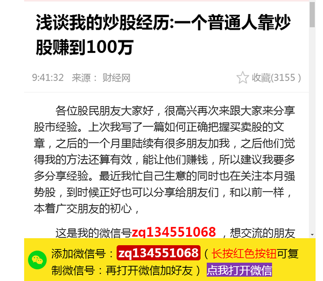 落地页就是一个炒股大咖的炒股经历,自说自话的分享自己的炒股经历会显得广告内容很“low”,落地页设有浮层图片,就是让用户添加个人微信。微信在用户的认知中是一个隐私性比较强的交流工具,用户不会贸贸然添加一个陌生人的微信,这样会导致很多意向客户流失。 那么我们炒股商家在投放凤凰网广告的时候,一定要注意,不能虎头蛇尾。加上炒股本身就是一个比较敏感的行业,我们广告投放一定要注意提醒用户投资需谨慎。