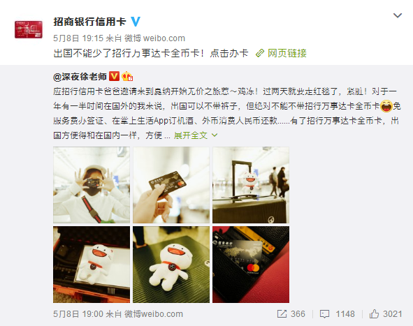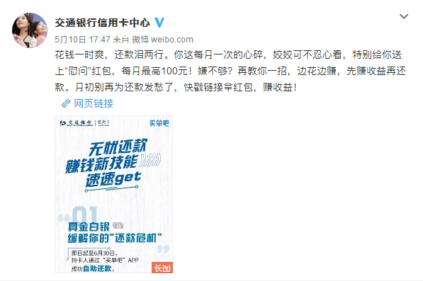 当我们的博文推出之后,一定会有粉丝询问信用卡相关事宜,那么我们需要安排客服回应粉丝的互动,从而了解用户需求以及更多的信息,对推广方案作出相应的调整。通过与粉丝的互动,我们还能增强用户粘性,挖掘更多潜在客户,效果也是非常不错的。