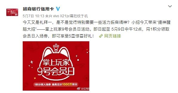 很多用户办理信用卡就是冲着信用卡的优惠活动去的,因此商家要多利用微博推广信用卡相关优惠活动,例如办卡优惠、电商产品促销活动等吸引更多粉丝关注,从而实现引流变现。 4、粉丝互动
