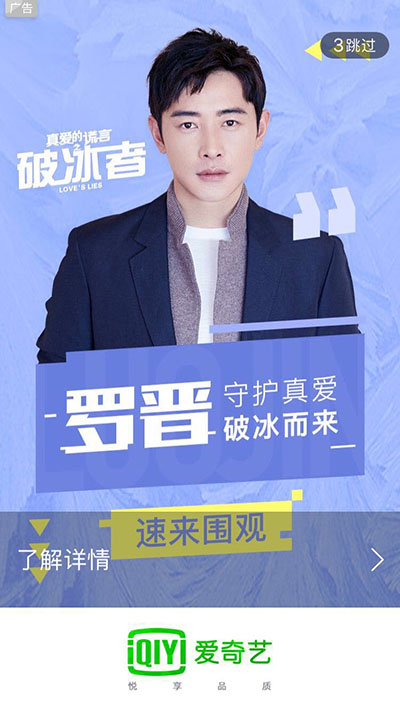 爱奇艺开屏广告的展现时间一般为3秒钟,用户可以选择“跳过广告”来关闭,不过3秒钟的展示时间对用户来说基本上没有那么快的手速来关闭广告,但是3秒钟的时间足够用户看完广告的核心内容,这也就是为什么开屏广告曝光率那么高的原因。 2、支持落地页跳转 如果广告不支持落地页,如果用户对广告内容有兴趣,结果广告直接展示完毕,影响用户体验。爱奇艺开屏广告是支持落地页跳转的,这给广告创意扩大了发挥空间,同时也不会流失意向客户。