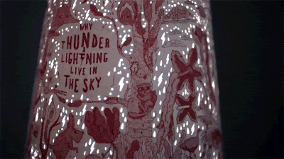 关上灯,将手机手电筒打开,放置在全家桶外包装内。手电筒透过镂空的小洞发出细碎的亮光,故事的主角便被投射到墙上、天花板上,活灵活现,神气十足。