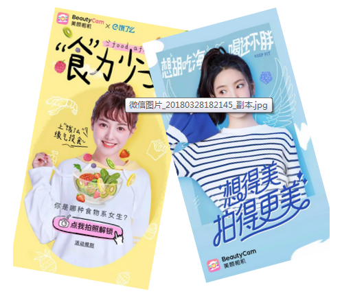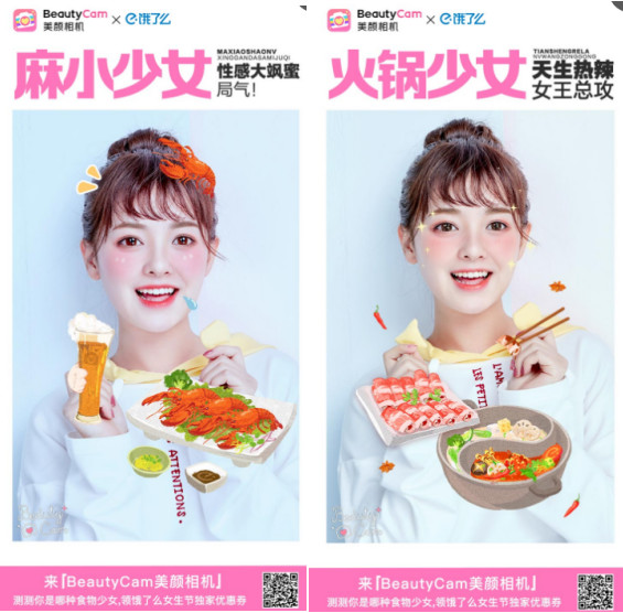 美图与美食,缘分相遇 当下,美颜类App已经成为大众的标配,强大的P图功能让受众拍出自己想要的feel,复古系、黑白系、森林系……只有想不到,没有美颜App做不到。而在所有美颜类App受众中,女性用户占比近八成,25-34岁用户占比59.2%,拍照修图App利用受众对于美的追求,正在成为越来越多年轻女孩装机必备的手机应用 。 在所有女性中,年轻女性无疑是最具“少女心”的群体,这群人爱自由、爱美丽、天马行空、率性天真。她们不喜欢说教式的营销和洗脑,更喜欢拥有自由的空间去表达自己,晒出自己的美丽。而美颜相机以“每位用户都是被宠爱少女”的品牌情怀,吸引了大部分女性受众,让女孩们真正成为自己的主人。 美女与美食的搭配古已有之,饿了么联合美颜相机,可以说是美食界和美颜界的扛把子强强联手,将二者的美再度升华,在受众中引起“共情”。在这个H5中,将食物拟人化,火锅、沙拉、寿司等常见食物对应不同性格少女,火锅成了女王攻、麻小对应直爽女、沙拉变成森系女……萌萌的自拍搭配食物 AR 特效,极具少女力,自然吸引了众多年轻受众的参与热情。