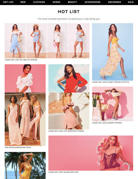 这个结果不意外,时髦女孩们追求「好看且独特」的选择,多合理。本着「买一赠五百」的热情,「Annstand X 时尚营销」第一篇要聊聊carry了700+品牌的小众电商平台,充分满足大家对小众品牌的期待。 1.风格:永远走在潮流前面 纵观国内时尚电商市场,Tmall为了迎接大牌进驻,不惜自宫打假;JD为了挤进时尚圈,老板娘都亲自上阵;外来巨头Farfetch,已经来华跟local紧紧抱团;而另一巨头Net A Porter,也早早跟国内各大网红博主亲如一家。而籍籍无名的REVOLVE,凭什么在10年前就成了中国时髦女孩们都在悄悄前往下单的时尚网站呢? 首先,长得漂亮! 不论是网站本身、社交媒体还是newsletter,来自美国加州的REVOLVE都给出了极具洗眼效果的内容。就算随便翻翻它的catalog,很多配色、款式、搭配也能给你不少日常穿搭的灵感。
