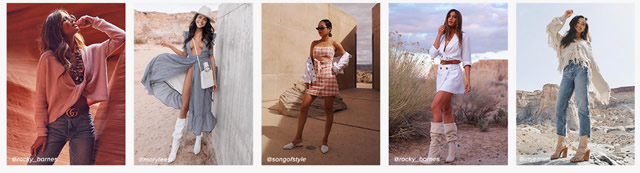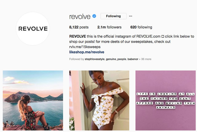 坐拥2百万粉丝的Instagram 除了颜值高,风格讨喜外,REVOLVE最厉害的地方在于,永远走在潮流前面。如果一个单品初具爆款苗头,REVOLVE就会立刻掉头寻找下一个trend。就像四年前,当竞品网站还在为「爆款坡跟运动鞋库存太大」头疼的时候,REVOLVE已经开始推下一个即将热门的单品铆钉靴了。 所以,敲黑板了:想要引领潮流的女孩们,请务必锁定他们的官方Instagram账号@REVOLVE。 用团队自己的话来讲,他们只做时髦女孩的生意,并把目标受众定位为REVOLVE girl:“20到40岁的时髦精,玩转社交媒体,出席很多需要dress up的场合。她吃得健康,定期做yoga,时不时去club举着鸡尾酒high到半夜”
