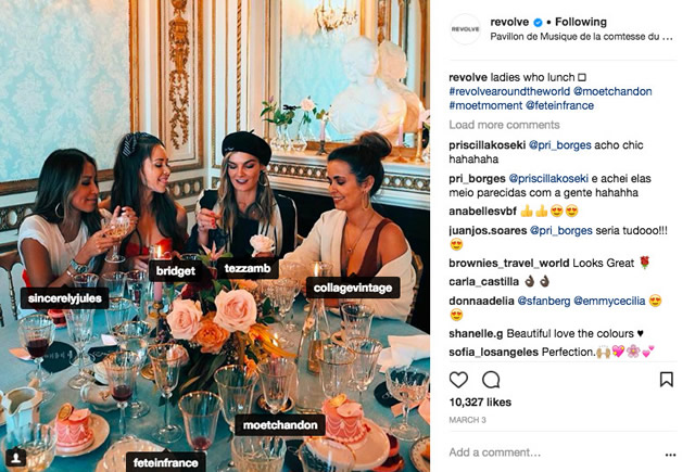 博主们和他们的男朋友在普吉岛 第二、三步:聚焦现有用户,创造好体验,形成口碑传播 有了清楚的TA定位和发展方式,那如何才能留住这些时髦女孩并让她们主动向人推荐REVOLVE形成口碑传播,继而带来更多用户呢? 用满意的体验!为了做到这点,我总结了REVOLVE正在实践的三个方向。 1. Community:营造社区 首先是线上部分。REVOLVE的社区(包括Instagram,Facebook,Twitter等)有强大的网红姐妹团:宋家两姐妹 Amiee Song和Dani Song(共500万+粉丝),韩裔加州女孩Jenn Im(160万粉丝),纽约白富美Mary Leest(110万粉丝),维密超模Chanel Iman(150万粉丝),小个子博主鼻祖JULIE SARIÑANA(470万粉丝)等等。
