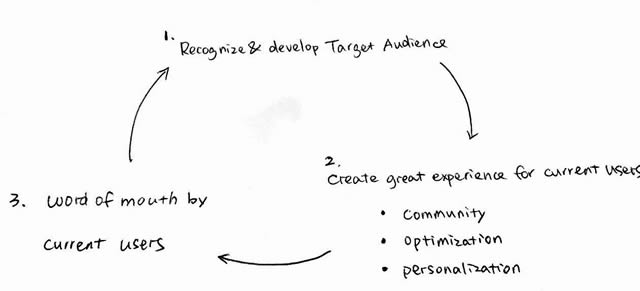 Michael Mente(左)& Mike Karanikolas(右) 因为在search engine上发现人们经常搜索设计师牛仔裤却鲜有网站提供购买信息,两位程序员由此发现商机,开始做牛仔裤电商。一路走来也颇为不易,比如为了能carry牛仔品牌7 for All Mankind,他们整整pitch了两年。 看到这里,你可能有疑问了。究竟是什么神秘力量让两个朴素的程序员摇身一变成了时尚弄潮儿呢?这就得聊聊REVOLVE的增长策略。 3.增长策略:stay focused, play safe 如果要简单总结REVOLVE的增长策略,我觉得「stay focused, play safe」是最好的概括。 a.stay focused 所谓stay focused,就是永远首先关注目标受众。关于这点,我总结了一份简易流程图。