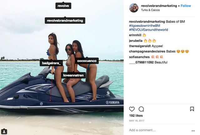 REVOLVE marketing girls like this 除了点燃从业人员买家卖家双重身份的热情,REVOLVE另一发展TA的方式就是,积极寻求和风格一致网红们合作,合作方式非常值得品牌们借鉴。相较于偶尔让博主们po一两张图直接推荐单品,REVOLVE的做法是,把她们都发展成了长期买家,甚至朋友,从而深度转化她们的粉丝。 可以看到,这些合作往往是长时间的细水长流,而且很走心。比如,年初的普吉岛情人节专题,REVOLVE就邀请了各位博主和她们的另一半,共赴海岛party。比如,REVOLVE的Chief Brand Offer @RaissaGerona和content creator @Cococuenco和博主Amiee Song根本就是共用一个健身教练的好朋友。