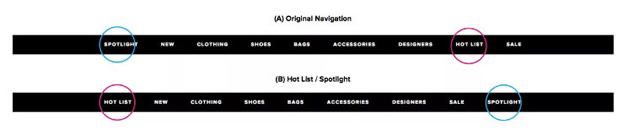 Melrose Avenue上的REVOLVE Revolve Social Club,作为REVOLVE social的核心活动,2年前也来过上海,与亚太区的土豪买家、网红博主们进行了愉快的拉家常活动。 2. Optimization:A/B Testing优化内容和体验 前文说到REVOLVE能走在潮流尖端,靠的是年轻女孩们的时尚触觉。但每个女孩都有观点和想法,怎样才能知道哪些能经得起市场的检验呢?这就是A/B testing发挥作用的时候了。比如,现有时尚idea A和idea B两个大家都觉得不错的选择,A/B testing要做的就是,两个idea都试试。将它们在同样的条件下随机地发布出来,通过一段时间后,检测它们的效果,最终选择表现更好的idea。 REVOLVE的A/B testing合作伙伴是优化平台Optimizely,他们对于网站的内容和体验细节进行了非常细致的实验。比如,navigation bar的顺序如何调整点击率最高: